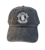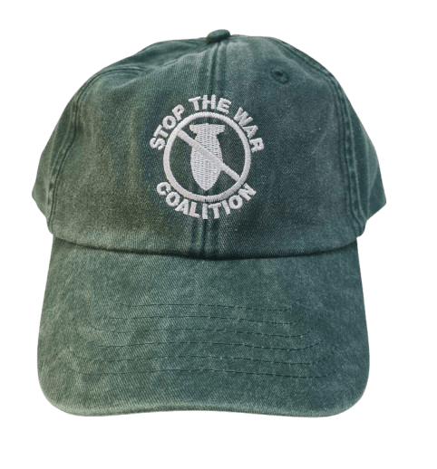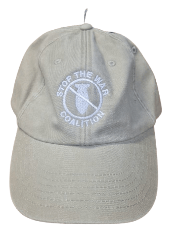 Vintage caps with stop the war coalition and the logo embroidered in white on the front.